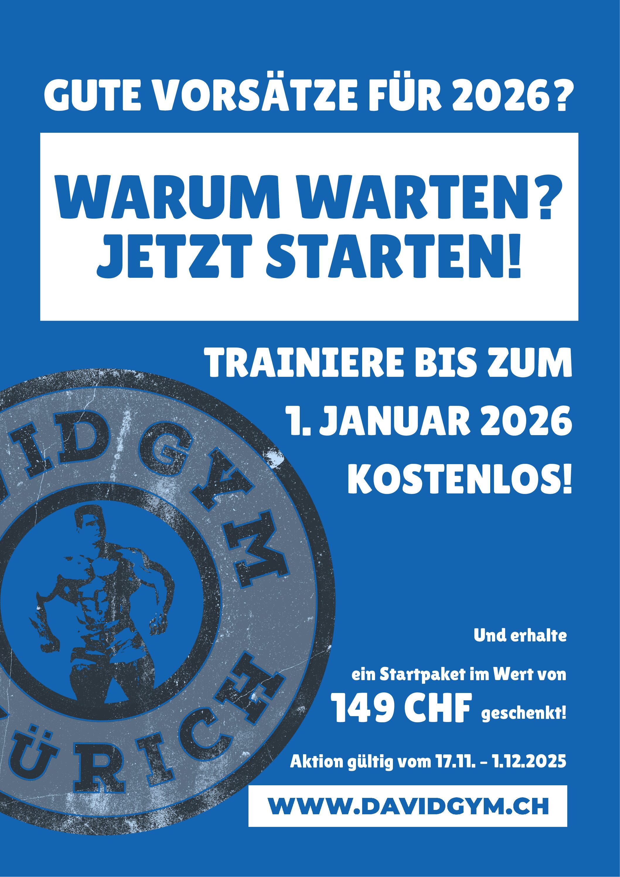 Warum warten? Jetzt starten! Löse eine Jahresmitgliedschaft vom 17.11.2025 bis 1.12.2025, trainiere bis zum 31.12.2025 kostenlos und erhalte erst noch ein Startpaket im Wert von CHF 149.-geschenkt. Melde dich zu einem unverbindlichen Beratungstermin im David Gym deiner Wahl an. Wir freuen uns auf dich.